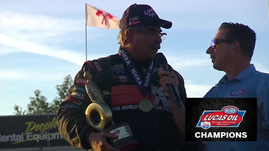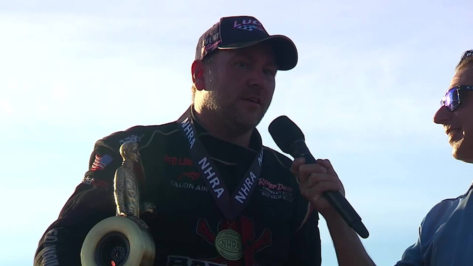 Topeka Top Alcohol Dragster winner Hunter Green scored his second career win and joined his father, Funny Car winner Chad Green, on the victory stage in Pomona after defeating Kim Parker in the final round, 5.19 to 5.44.