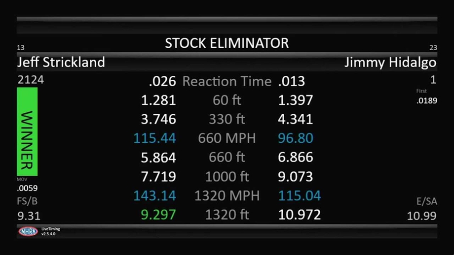 Jeff Strickland earned career win No. 21 following a tough final-round battle against reigning world champ Jimmy Hidalgo Jr. in Stock. Strickland won in a double-breakout with a 9.279 on his 9.30 dial.