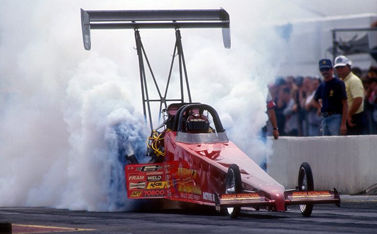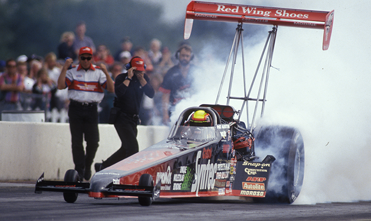 After Garlits’ three-year, mid-1980s monopoly, Amato took over the role of Indy dominator, winning it three times in four years, missing out only in 1989 when he lost in the semifinals to Dick LaHaie. His 1988 title was a fortunate one as he was racing Gene Snow, who had made the quickest NHRA pass in history, a 5.00 in the semifinals. Amato and crew chief Tim Richards, who had run a best of just 5.07, hopped it up for the final and smoked the tires, but Snow broke the throttle linkage just off the line. Conversely, Amato was dominant in 1990 en route to the world championship and bested Darrell Gwynn’s replacement driver, Frank Hawley, in the final round.