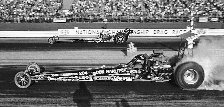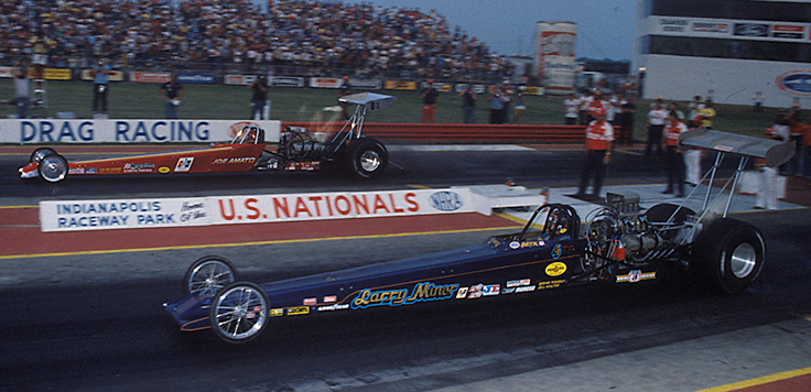 Three years after losing to Don Garlits in the 1968 final, Carbone got his revenge on “Big Daddy” in the unforgettable “burndown” final at the 1971 race. In 1968, Garlits had taken his time staging, and Carbone had gone up in smoke with cold tires. In 1971, Carbone vowed not to stage first, and both drivers staged with over-cooked engines and clutches, and it was Garlits this time who was up in smoke. Carbone was the last slingshot Top Fuel driver to win Indy.