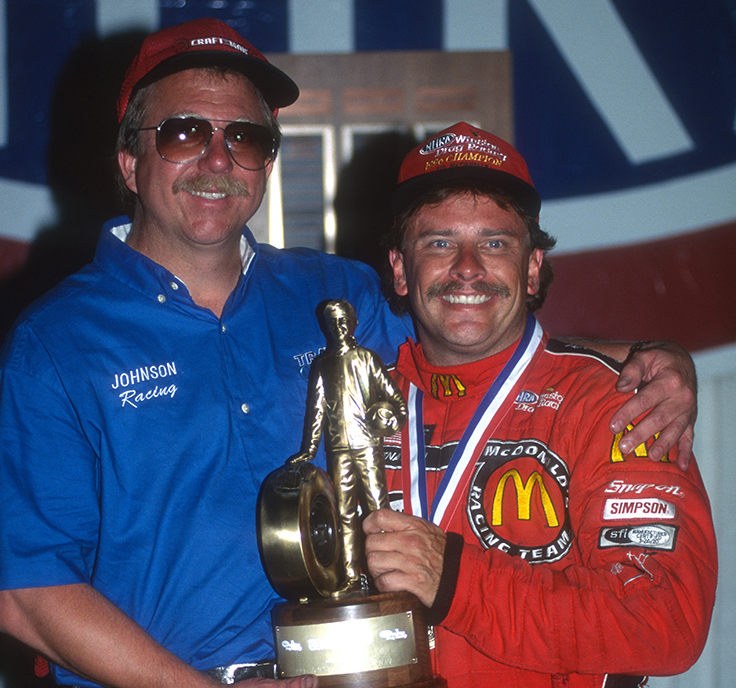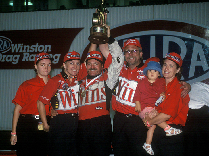 Two years after the Johnson family lost Blaine in that terrible Indy qualifying crash, they were officially back in the U.S. Nationals winner’s circle with Blaine’s heir, Gary Scelzi, in the Winston-backed dragster en route to a second straight world championship after defeating Mike Dunn in Darrell Gwynn’s dragster in the final round. More than a decade earlier, Scelzi had been runner-up to the eloquently named Eldon P. Slick in the 1986 Top Alcohol Dragster final in Indy.