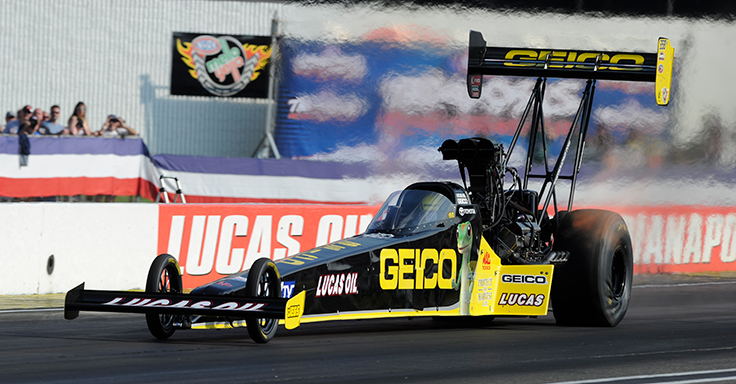 A year after Richie Crampton’s win, his stablemate, Morgan Lucas, who had won Indy in Top Alcohol Dragster back in 2003, scored the 23rd and final win of his career (12 of which came in Top Fuel) when he defeated Pro Stock racer turned Top Fuel pilot Dave Connolly, who was driving the C&J Energy Services dragster of 1995 Indy Top Fuel runner-up Bob Vandergriff Jr.