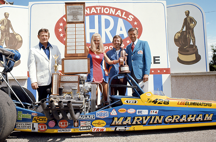 Like Gary Beck, people think that Marvin Graham came out of nowhere to win the 1974 title — inspiring the still-lasting nickname of “Who?” — but the Oklahoman had been racing Top Fuel since 1967, just on a local basis. When he got serious in 1973 and 1974, Graham hired Chester Garris to tune his car and future Top Fuel racer Steve Hodkinson as his crewmember and bought a state-of-the-art 3/8-stroke mill from West Coast engine ace Mike Kuhl. Graham, who ran the family television repair business, Graham Radio and Television, a small one-man operation in small-town Britton, Okla., came down with the flu in Indy but nonetheless gutted it out and beat Gaines Markley in the final.
