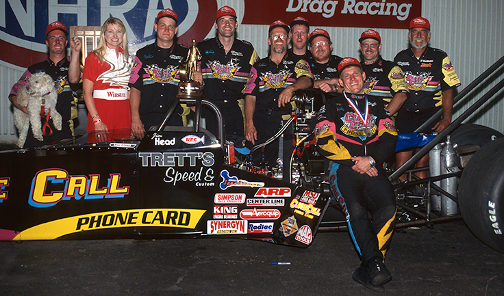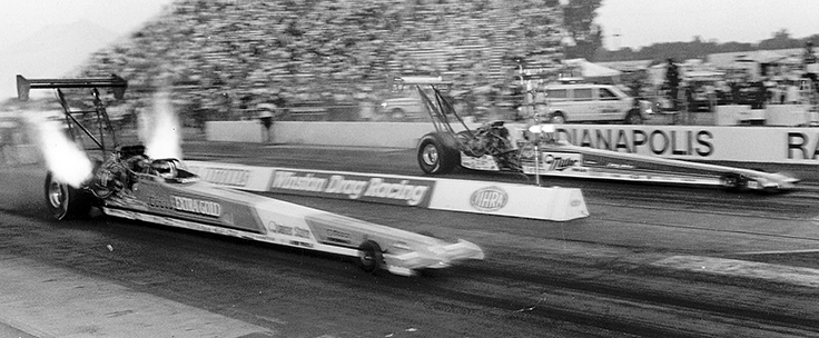 Eighteen long years after Don Prudhomme first accomplished the feat in 1973, the Budweiser King became the second to win Indy in both nitro classes. Bernstein had already been crowned Indy’s Funny Car champ twice (1983 and 1987) before returning to his Top Fuel roots in 1990. It only took him two tries — and a bit of luck — to add an Indy Top Fuel trophy to his mantel, winning the final round on a tire-smoking pass after Pat Austin’s mount had backfired the supercharger on its final-round burnout.