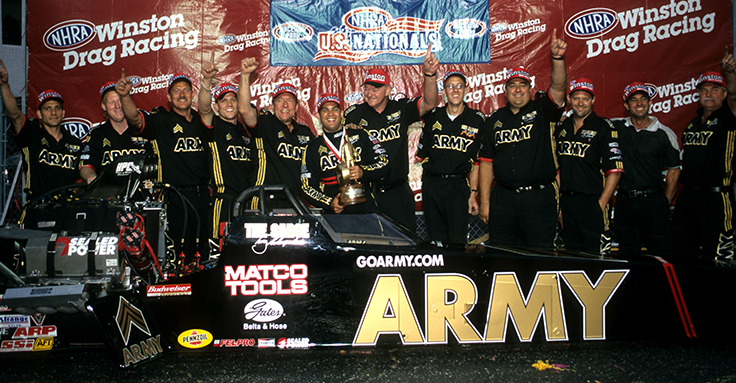Schumacher won Indy for the first time four years later in 2000, in the debut of what would become a long-running sponsorship with the U.S. Army, and again in 2002 with crew chief Dan Olson. Alan Johnson replaced Olson in 2003, and the duo won six of the next seven U.S. Nationals, interrupted only by Larry Dixon in 2005, and even then, Schumacher was the runner-up.