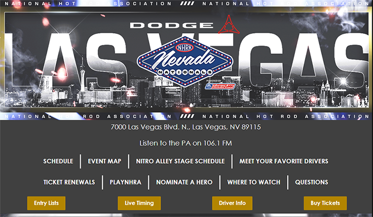 Planning to attend or even watch this weekend's Dodge NHRA Nevada Nationals powered by Direct Connection? Check out our event guide, which features ticket information, event schedule and news, entry lists, a facility map, the Nitro Alley schedule, driver bios, and much more.