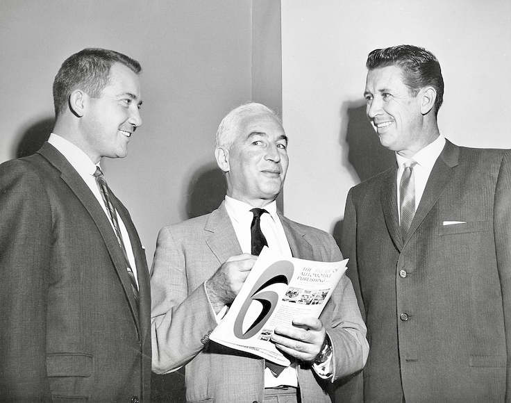 (Seen from left to right: Hot Rod magazine's Robert E. Petersen, Chevrolet's Zora Arkus-Duntov, and NHRA's Wally Parks)