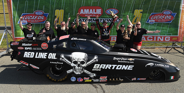 “We don’t count points over at Bartone Racing,” Bellemeur attested. “We let NHRA tell us. Our goal is to win the next run: qualifying, testing, or eliminations. Part of the allure of winning a championship is the fact that when they tell you that you’ve finally done it, boy, it hits you like a ton of bricks. I had no idea that it could have happened in round one. I had just won my round ahead of Brian, and one of the officials at the top end took me to the TV monitor, and I kind of peeked over at it. Brian Hough was up, and at first, it wasn’t even clicking to me, and then it dawned on me, and there’s two cameras on me, and I thought, ‘Well, wait a minute, I’ve seen this on TV before. That means something could happen.’