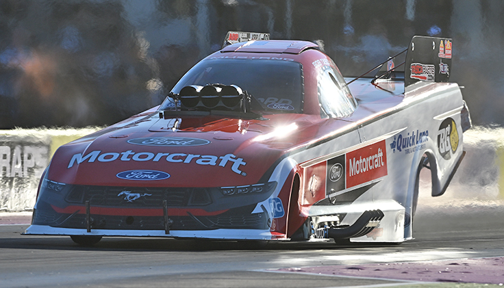 As it usually does, the Funny Car No. 1 spot was cemented as soon as world champ Austin Prock ran. Usually, it's at the end of a session, but after the Cornwell Tools team failed to make it down the track in Q1, they came up early in Q2. Chris King (4.157), Cruz Pedregon (3.929), and Paul Lee (3.915) all had the saddle before him, but "the battle" ended 3.876 seconds after Prock left the starting line and took the spot from Lee.
