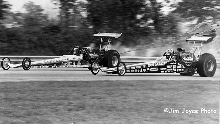 Don Garlits and Gary Beck famously dueled for both the IHRA and NHRA Top Fuel world championships in 1975. Joyce captured this shot of 1974 NHRA champ Beck dueling with Garlits at Dragway 42. My research showed they faced each other in the final round there in August, with Beck winning, 6.00 to 6.03. I don’t know if this is that race or maybe from qualifying, but it’s really cool.