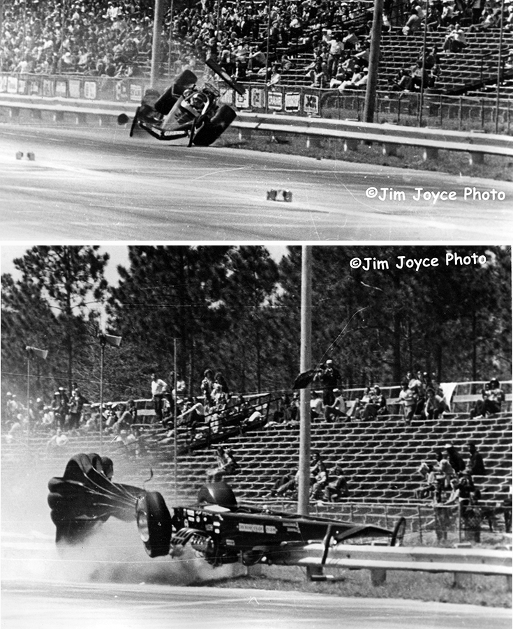 Joyce: "That was my first race with a motor drive. I had just bought my first Nikon from Barry Wiggins, and it had a motor drive. I’m pretty sure that Jon Asher and I walked down to the top end at Gainesville and we were standing underneath the scoreboard, and I had a 200mm lens watching ‘the Greek’ coming down the track, and all of a sudden I see the car turn and then he’s up on the guardrail and his head's right next to the guardrail and the engine's still running. Look at the tires.
