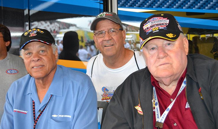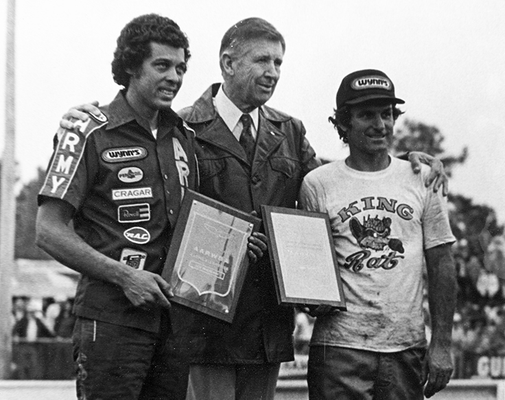 Here's a shot from the other end of the track of Prudhomme and Garlits as they were congratulated by NHRA President Wally Parks for being voted as First Team members by the Auto Racing Writers and Broadcasters Association.