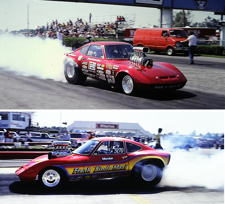Here’s a couple that are very near and dear to my heart, the Frank and Linda Mazi’s supercharged BB/Altered Opel that I got a chance to drive back in 1984 for a story in NHRA National Dragster that I called Altered States [Part 1 | Part 2].