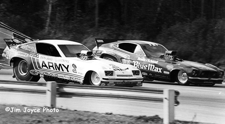 Another great “in the lights” photo is this one that Joyce snapped of Don “then Snake" Prudhomme and Raymond Beadle and the Blue Max at the 1976 Gatornationals.