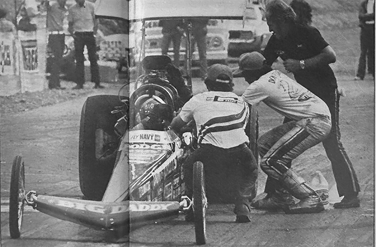 “One time we were running the Funny Car at Martin, Mich. — we hauled ass over there; it was a good night — and coming up the return road where the fans were right there on the chain-link fence, some fan threw something at me — a Coke, I think it was — and it hit me right in the face in the cockpit. I grabbed the brake, jumped over the fence, and ran after that guy and beat the shit out of him right out in the parking lot. The cops didn't do anything about it; they told him it was no big deal. Stuff like that was common back then; you could get away with it back then; sponsors weren't what they are today."