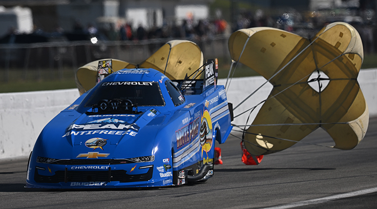 Ron Capps, who has been to the last two Indy finals — winning in 2023 and runner-upping last year — opened his Monday account with a holeshot win over Rookie of the year frontrunner Spencer Hyde, 3.876 to 3.869, tripping the win light by a razor-thin .002-second.