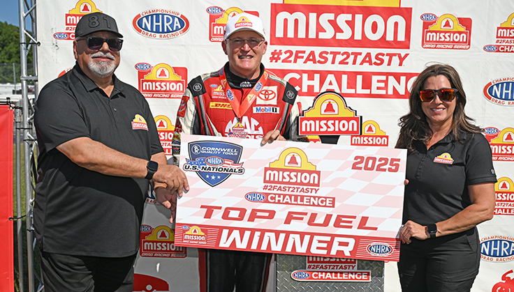 “Those points are going to be crucial,” said Anderson of the points earned after winning the Mission Challenge. “But the good news for me is that I came here with a plan. It’s tough week [with the passing of Ken Black], I came here to honor the Black family, Judy and Ken Black, and so far, I'm right on schedule. I qualified number one so far, won the Mission #2Fast2Tasty NHRA Challenge. Hopefully I can keep functioning [like that] and make it all the way on Monday. I love you, Judy. Thank you.”