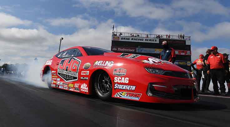 Low qualifier Jack Beckman dodged a bullet when his PEAK Camaro hazed the tires down track against Dave Richards. Beckman still managed to run a 3.895 at “just” 319 mph, while Richards made his best run of the weekend at 4.002.