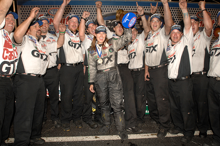 In 50 years of NHRA competition, 15 women have competed in the nitro Funny Car ranks, and just four of them have reached the winner’s circle, and it’s fitting that the first came from Funny Car royalty. Ashley Force Hood, eldest of John Force’s three racing daughters, scored the milestone victory at the 2008 NHRA Southern Nationals outside of Atlanta, where she beat her famous father in the final round. It was selected as No. 5 on NHRA's fan-voted list of Top 75 Moments in NHRA history.
