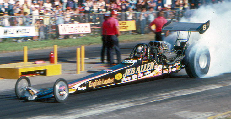 Eventual world champion Jeb Allen beat the Jim & Alison Lee team and driver Butch Osmon in a great Top Fuel final in which Allen’s English Leather rail ran 5.78 at 250 mph (top speed) to hold off Osmon’s 5.81. Connie Kalitta had low e.t. at 5.72.